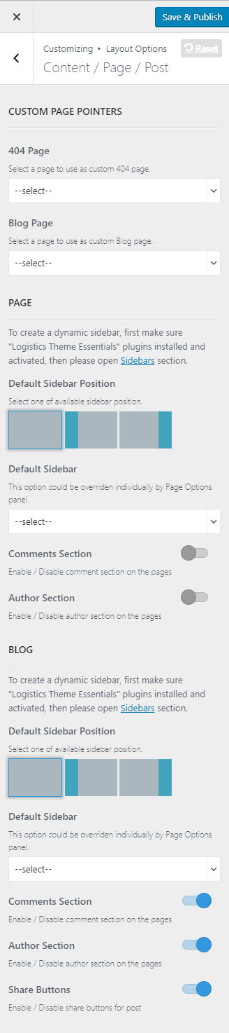 LogiTech lets you choose a number of options for how your Blog and posts will look throughout your site. All options are in the theme options “Appearance > Customize > Layout > Content/Page/Post” tab. Also you can choose a blog listing templage via “page templates” (see attached screenshot)