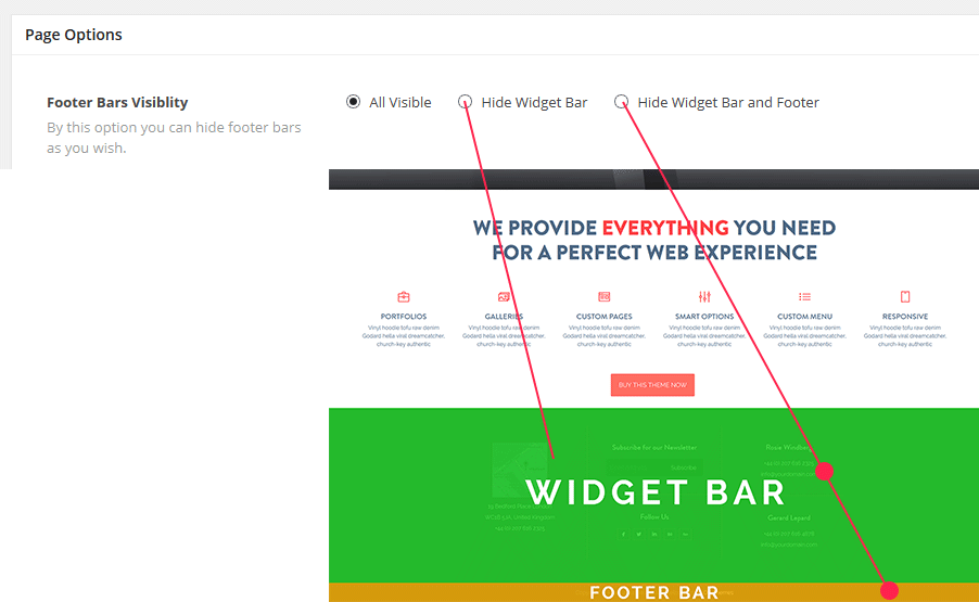 By default footer and widget bar comes in visible mode. In case you need to hide footer or widget bar please select via ““ option
