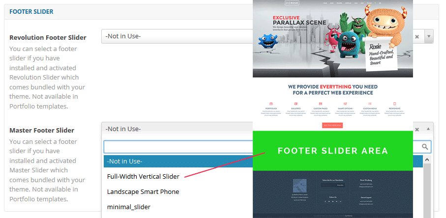 Adding footer slider in one click just easy. Just select your current Revolution Slider or Master slider via combo box and you’ll get the result in a sec.