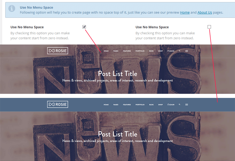 By default this options comes disabled. In case you need to create a page with transparent menu on content individually please make sure selected “Use No Menu Space”