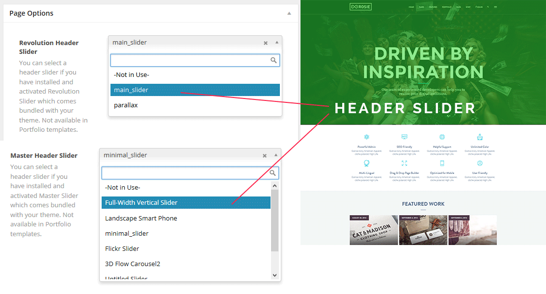Adding header slider in one click just easy. Just select your current Revolution Slider or Master slider via combo box and you’ll get the result in a sec.