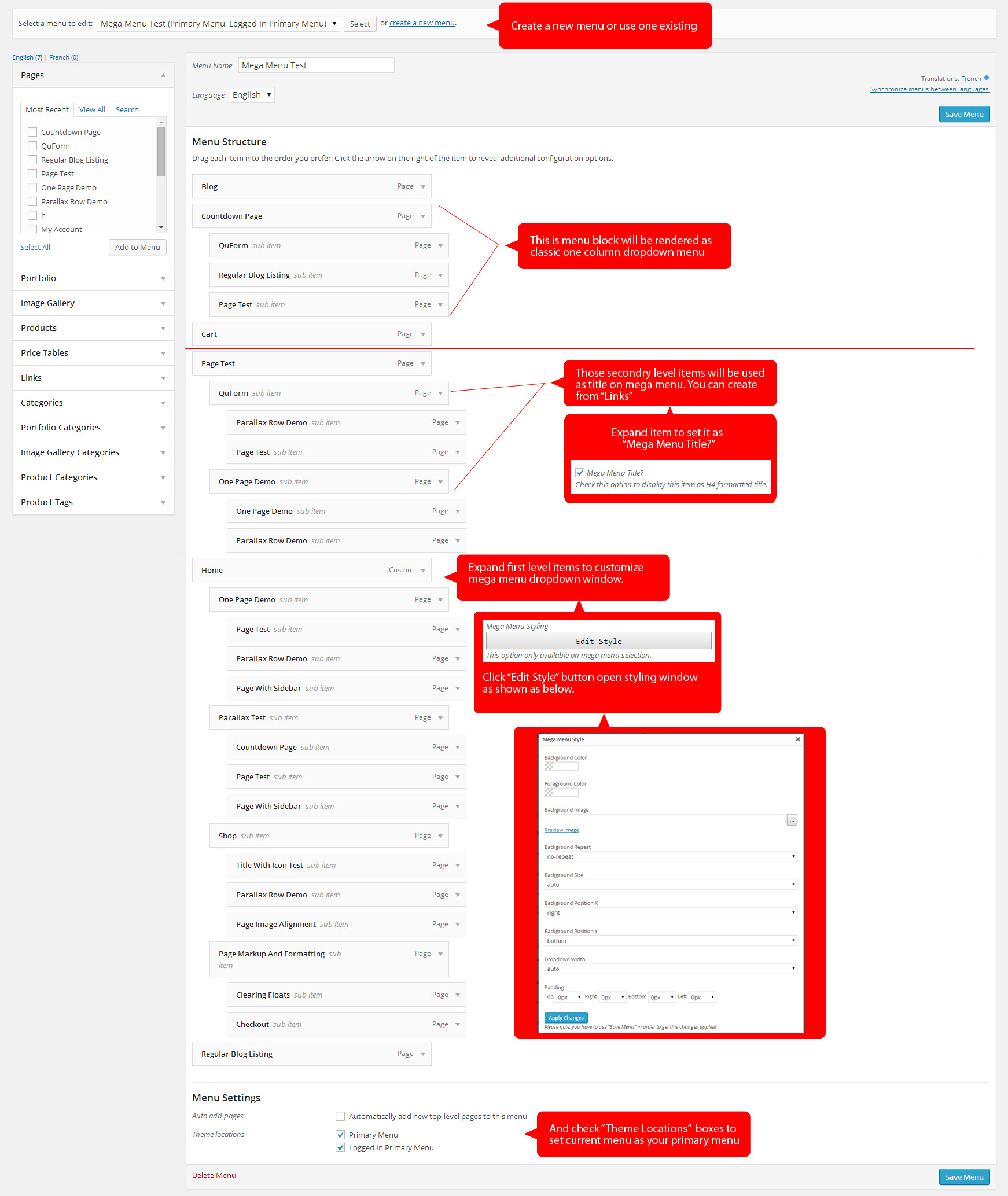 To create a menu please go to “Appearance > Menus” page. See labeling on the following image to understand what you have to do for a mega menu. (Please expand following image to see details clearly)