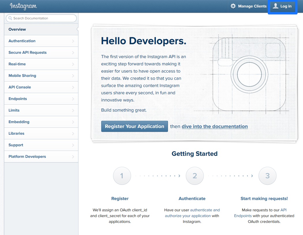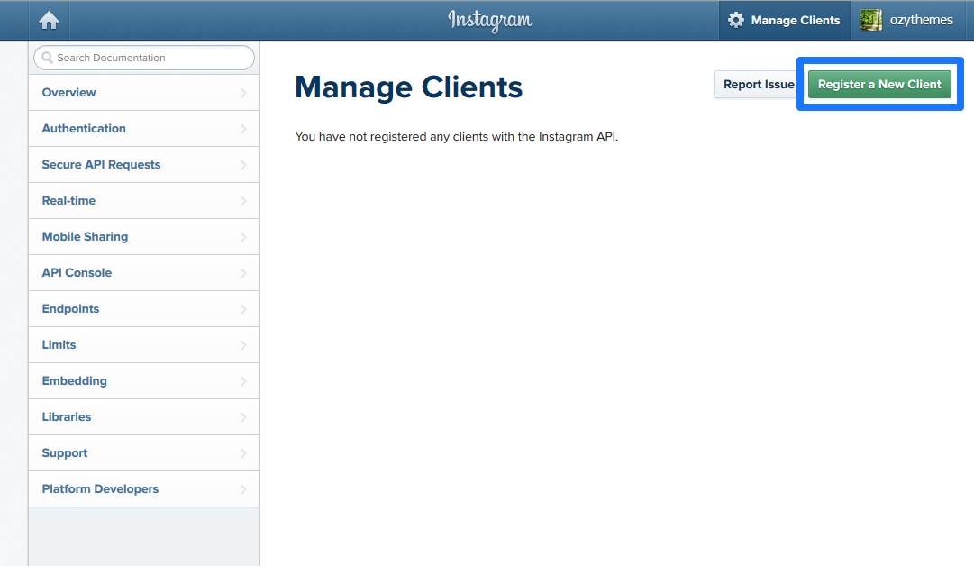 After successful login you will see Instagram developer client dashboard. Now, click on Register Your Application button which is highlighted in below screenshot.
