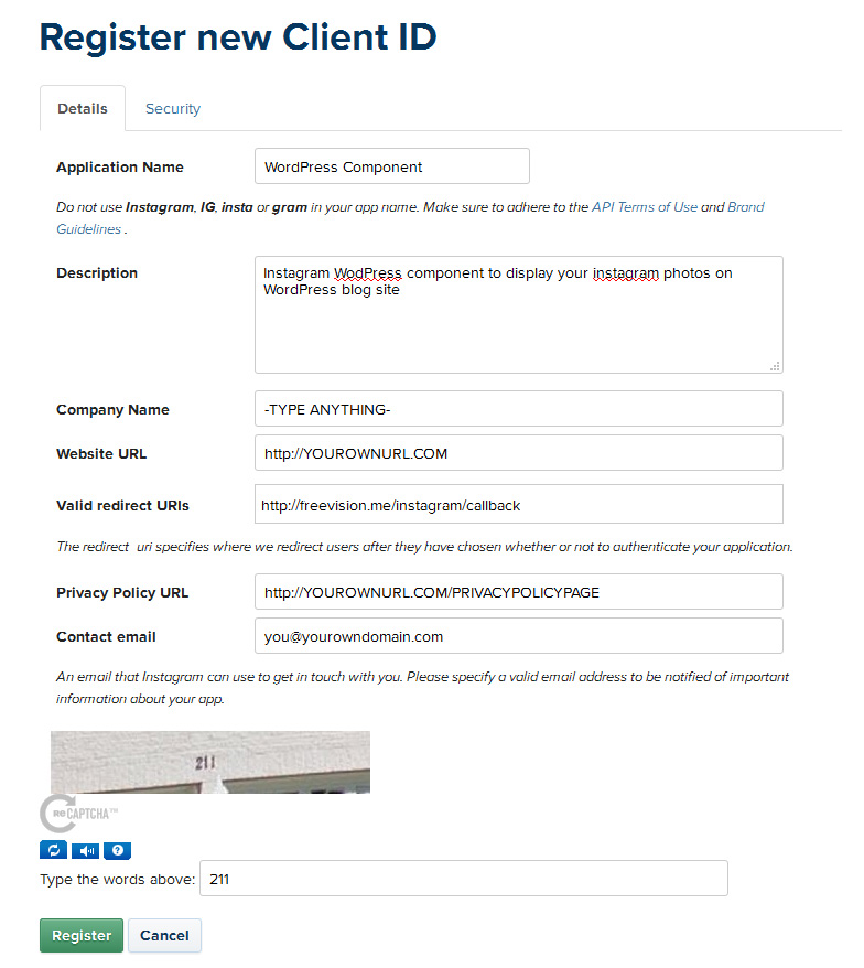 A Register a New Client Id form page will open on same screen. Fill the form details according to your application needs. In this tutorial we are filling the details according to Instagram Shortcode & Widget WordPress plugin. And the sample details as below: