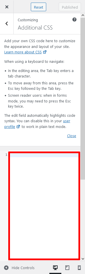 You can paste or write your code in the highlighted editing area. The Additional CSS section allows you to insert your CSS code in a large text area field. The CSS code is immediately applied to the live preview on the right hand side, which means you can try CSS code safely before saving it.