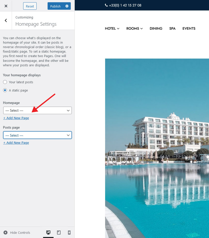 Click the drop-down icon under homepage or posts page to select the Homepage or blog page respectively.
