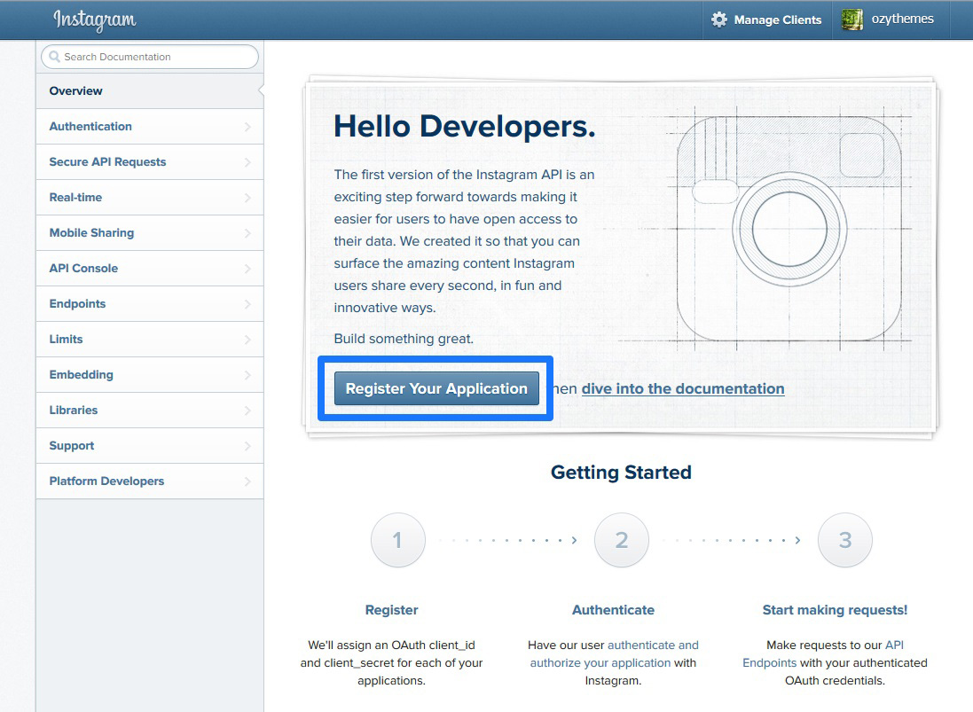 After successful login you will see Instagram developer client dashboard. Now, click on Register Your Application button which is highlighted in below screenshot.