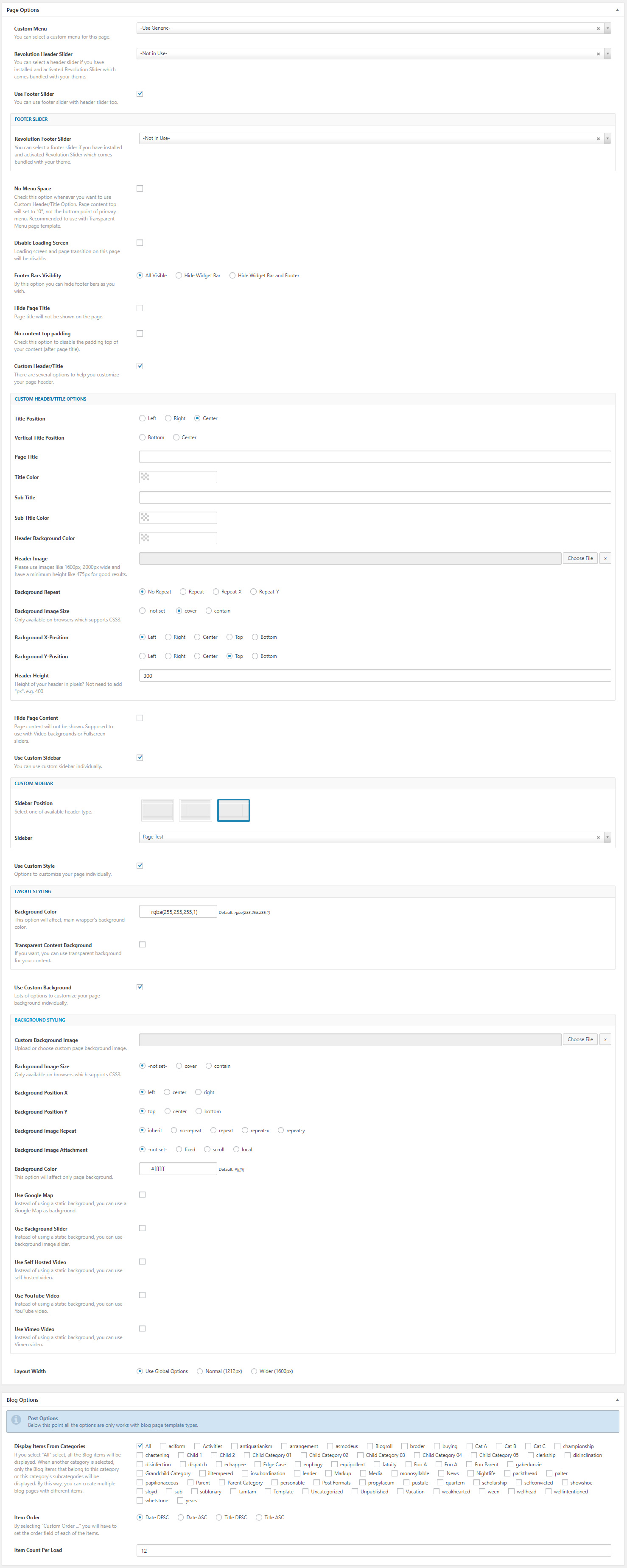 Theme allow you to customize individual page options such as; displaying custom menu, Revolution Slider header, Disable Loading Screen, Hide Page Title, Custom Header/Title, Custom Style, Custom Background and many more.