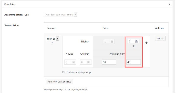 Since version 2.7.5, you can set up different per night rates if a booking is placed for certain