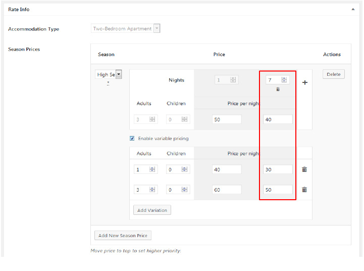 you want to edit or add new. To add variations based on the number of booked dates click +:
